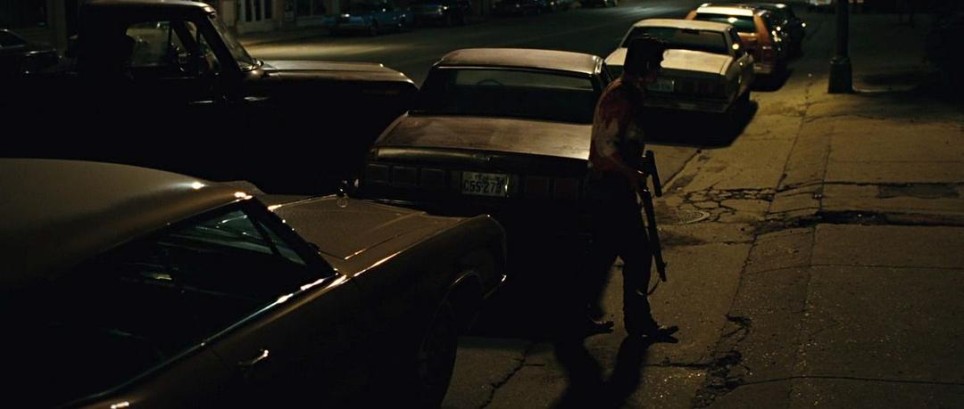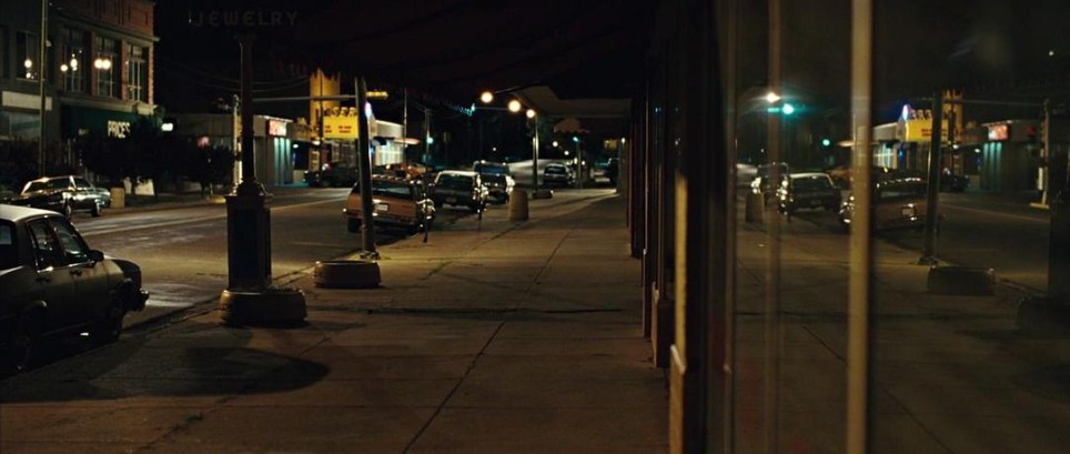 画面中唯一的主动光源是街道路灯,属于典型的人造暖光(2700K - 3000K色温区间),其特征与电影内核深度绑定: 低照度≠无存在感:街灯亮度仅够照亮街道局部(车辆顶部、人物肩部),却让90%画面陷入暗部——这是《老无所依》“反好莱坞打光”的核心:拒绝“主角式补光”,用弱光模拟现实中夜晚的“信息缺失”,暗示暴力随时从暗处爆发(如Chigurh突袭Moss时,旅馆走廊的昏黄顶灯)。 暖色调的欺骗性:暖光本应传递“安全、怀旧”,但在电影语境中,它是暴力的糖衣。
