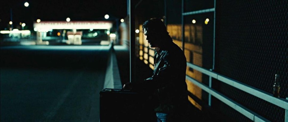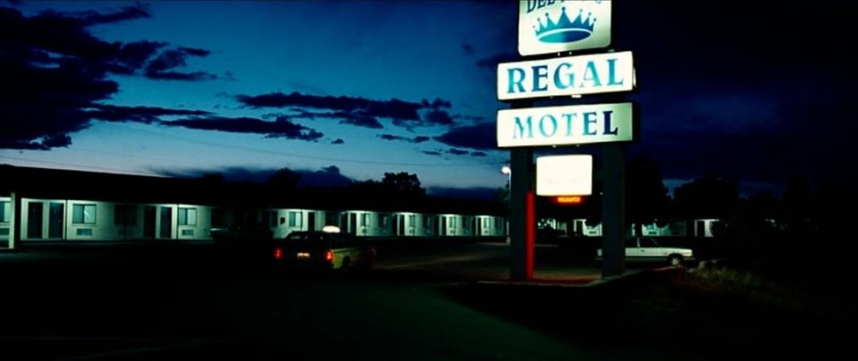 日落后“蓝调时刻”(Blue Hour),天空残留冷青色微光,光线弱且均匀,作为环境底光奠定冷寂基调,用1/2 CTO + Straw 013J滤镜改造灯光,让背景实用灯(Practical Light)呈现钠灯特有的暖橙色光晕。这种滤镜组合精准模拟钠灯光谱(589nm双黄线),使画面远处建筑轮廓在暮色中透出暧昧的暖调,与天空的靛蓝形成「冷暖张力场」暗示motel作为「过渡空间」的叙事属性(既是栖身地,也是危险的中转站) 车内弱暖光→车外冷环境光→ motel暖调实用光」的三重过渡,通过 「极少额外补光」(“used very little in the way of lighting that was in addition to what you see in frame”),让暮色+实用灯成为光场主导,镜头运动的明暗变化完全贴合「人眼夜晚观察的生理逻辑」——比如远处motel招牌亮度略高于建筑本体,既符合霓虹光源属性,又引导观众视线聚焦标识,继而注意到建筑群的「静谧危险」(阴影中藏着未知)。