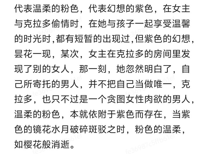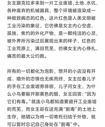女主朱莉·安娜,她神经质、焦虑、缺乏安全感,从她丈夫与外人的交谈中得知,女主曾经遇过车祸,虽身体无大碍,但脑部受到了震荡,丈夫轻描淡写的口气好像事不关己,充斥着冷漠与自私。女主的存在与周围的世界格格不入。蓝色,冰冷、抑郁、疏离;白色,虚无、困惑、寂寞,房间中色彩的渲染大量采用蓝色与白色的交织,放大了不安和孤独,她与丈夫乌戈的感情,同工业区的废墟一样,呈现一种破败的状态。